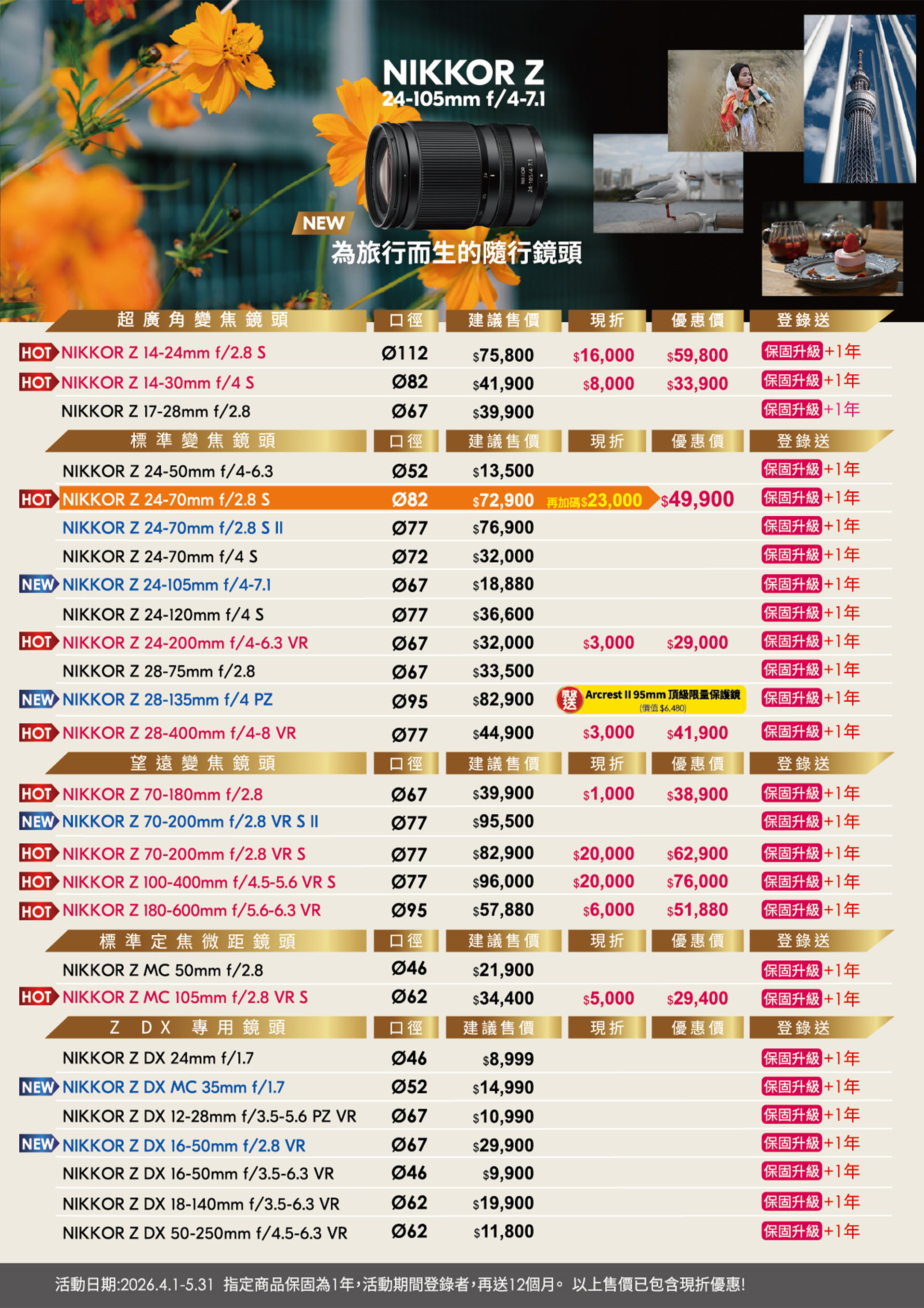 🔥115/4/1~115/5/31🔥活動期間登入保固升級2年,加送EN-EL15c(價值$2,800)和 Nikon X PGYTECH聯名相機背帶(價值$1,750)